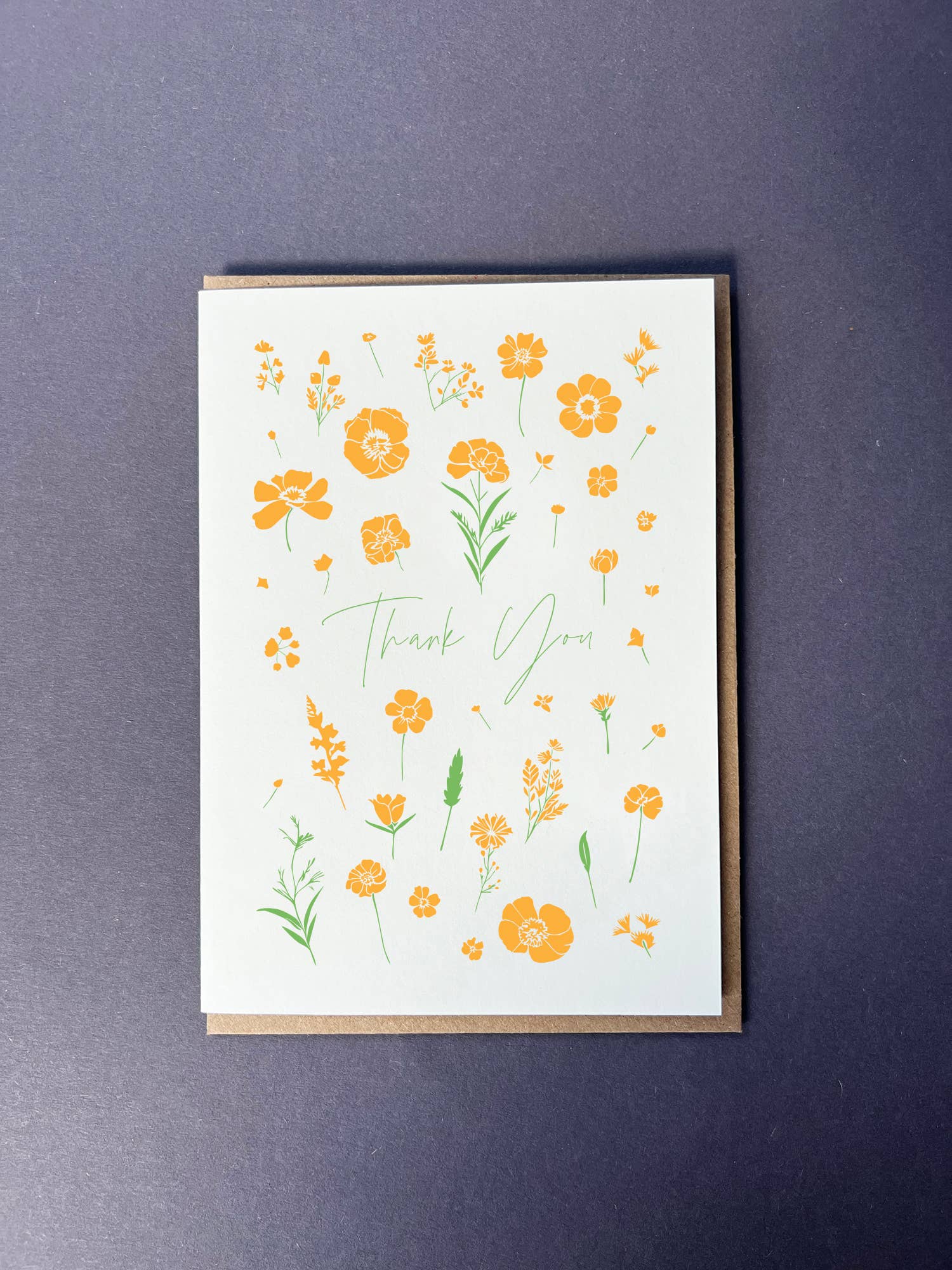 This gorgeous letterpress greetings card thank you flower press is illustrated with a variety of pressed flowers and foliage. Printed in yellow and vibrant green, with modern calligraphy “Thank you”. Perfect for saying thank you to any nature lover.
